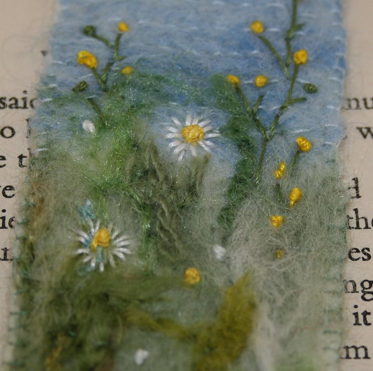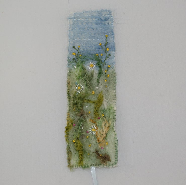 A wildflower meadow, embroidered and felted, decorates this bookmark - one of a series but each composition is unique and individually hand-stitched.