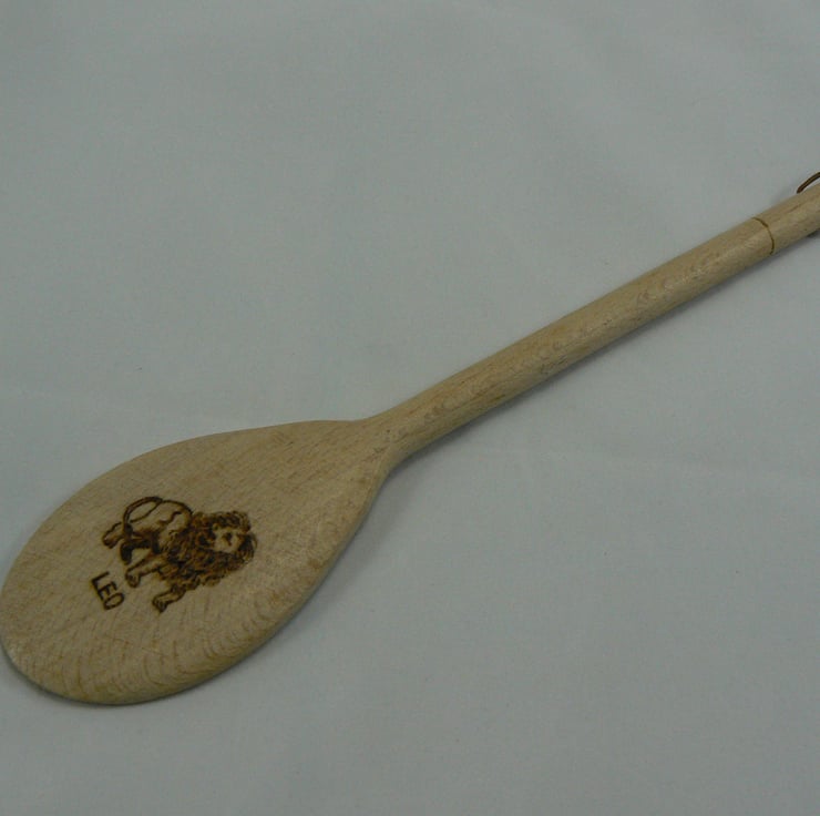 This wooden spoon features a star sign that I have burnt into the wood (Pyrographed) and I have added a leather cord.
