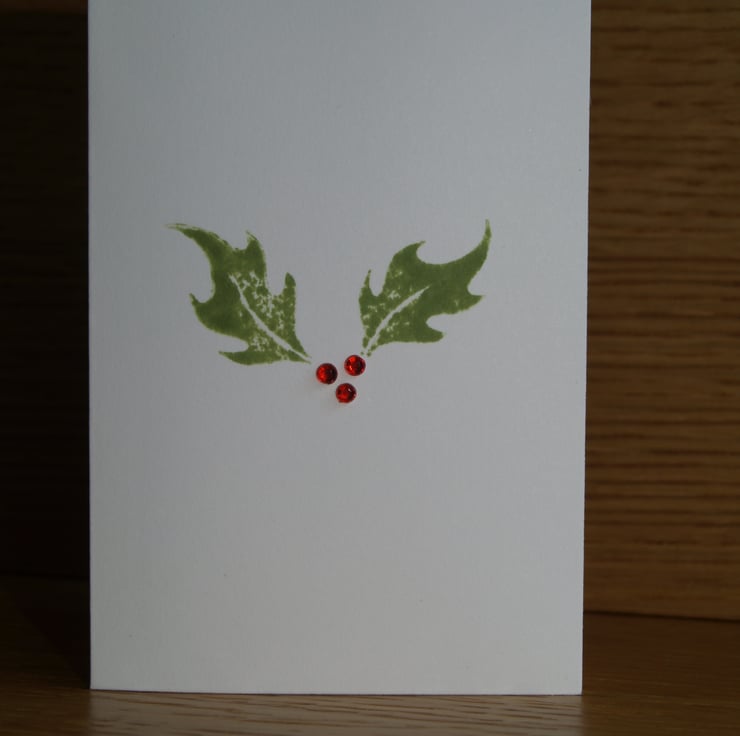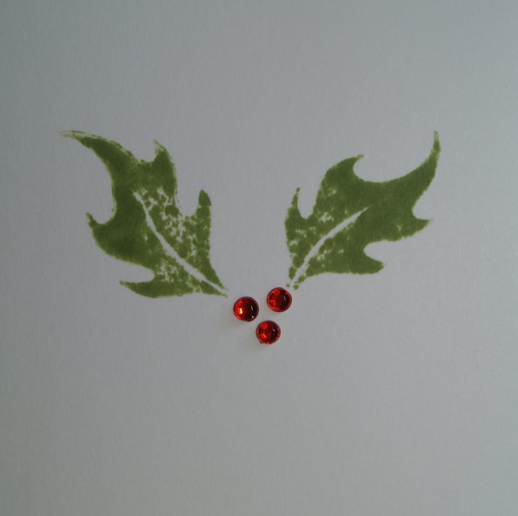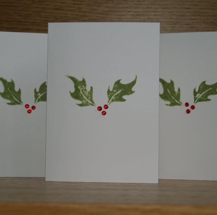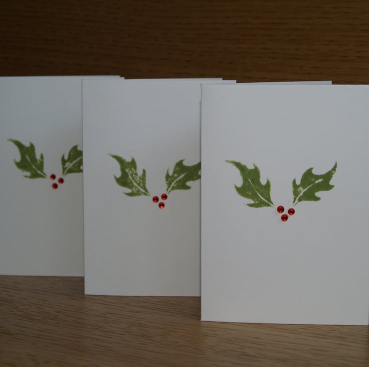 This pack of little Christmas cards contains three unique, hand decorated cards featuring hand stamped holly leaves and shiny jewel-like berries! They are plain inside.