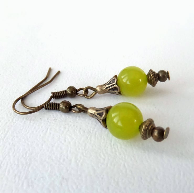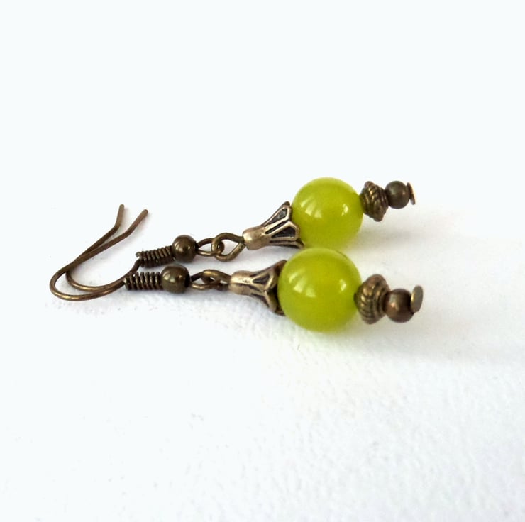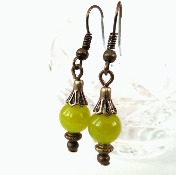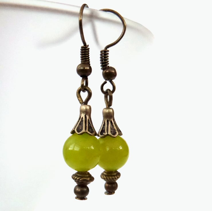 A great combination of peridot coloured jade and bronze look fabulous together in making these unique earrings.