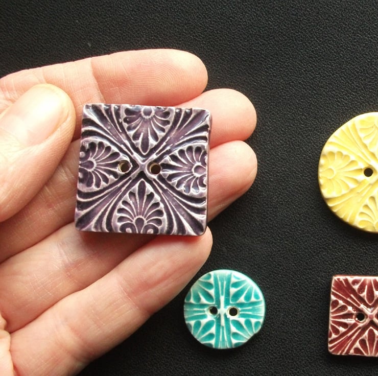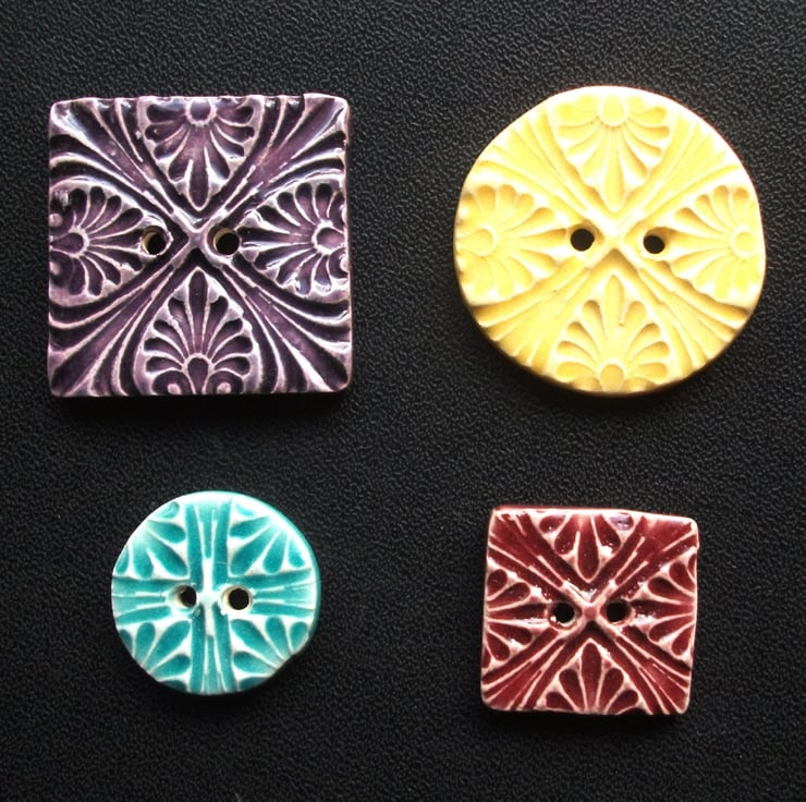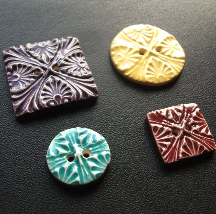 This set of four buttons are made from white earthenware clay, embossed and glazed to 1100 degrees, so nice and strong.