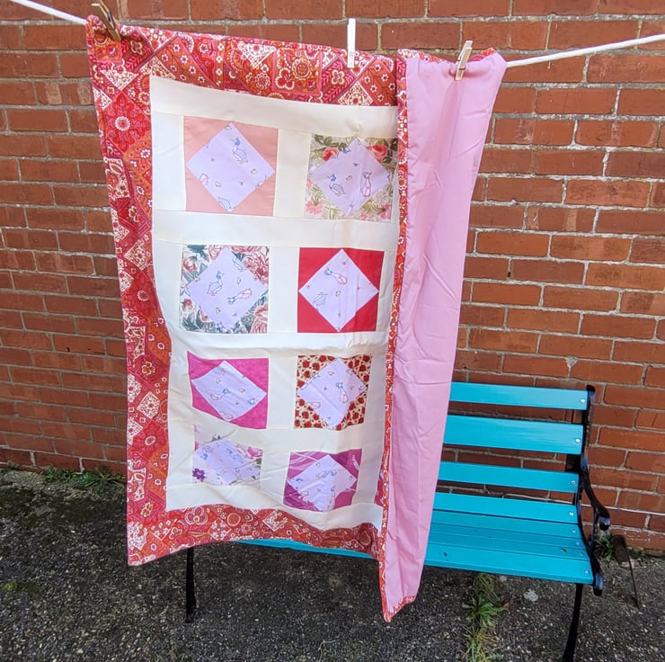 Homemade colourful Jemima puddle duck baby/child quilt. 100% cotton top. pink cotton fabric backing. Inside is 2oz polyester wadding.
