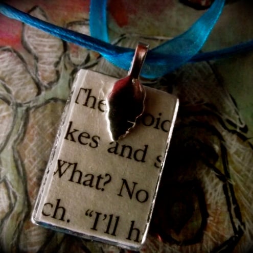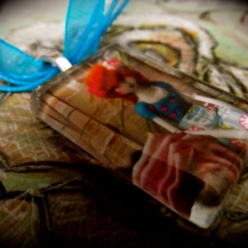 Glass tile pendant displaying an image of my art work, the image has been sealed in a glaze to make it water resistant.