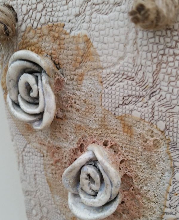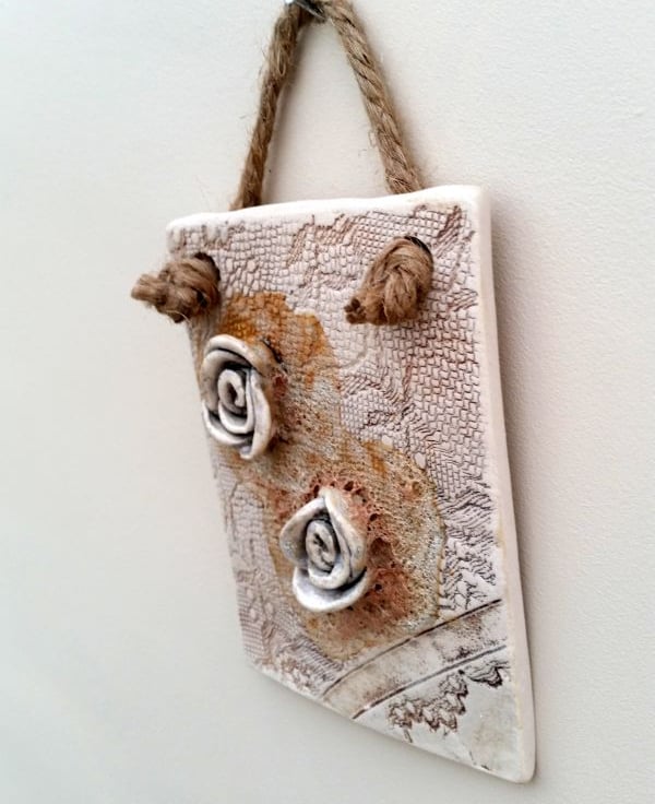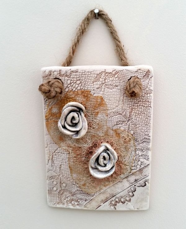 This handmade ceramic plaque measures approx 12 x 10cm, and has a brown lace texture impressed into the surface with two ceramic roses.