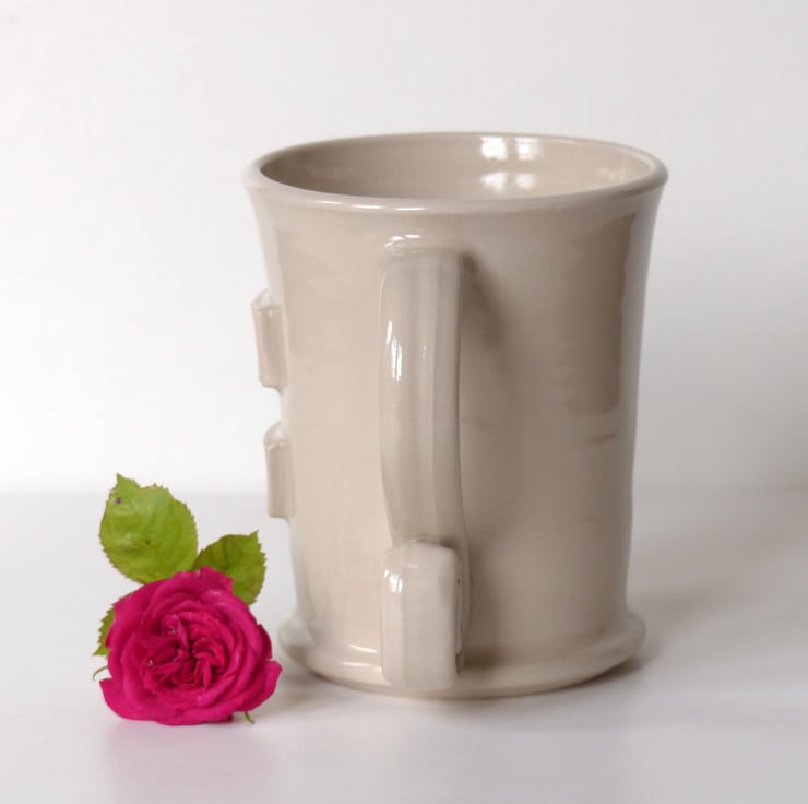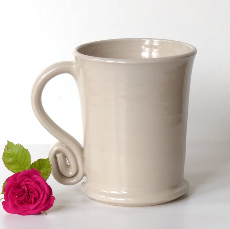 I threw this mug on the potter's wheel using a white stoneware clay. I then turned the base and added the handle and decoration before bisque firing the mug. I glazed it using a lovely transparent glaze and again fired it, this time to 1240C stoneware making it strong and durable.