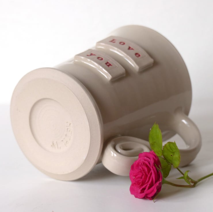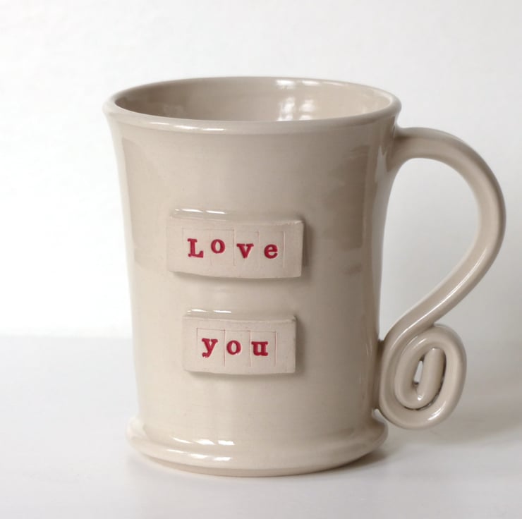 It has the words 'Love you' stamped into raised clay on the side of the mug.