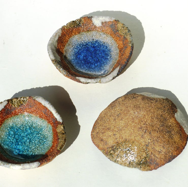 When I first discovered melted glass in ceramics I loved the contrast of the rough matt fired clay and feminine aura of the glass. I wanted to combine the two in a mature way to make a piece of peaceful beauty. They remind me of rock pools at the beach, pools of spring water, . . . . .