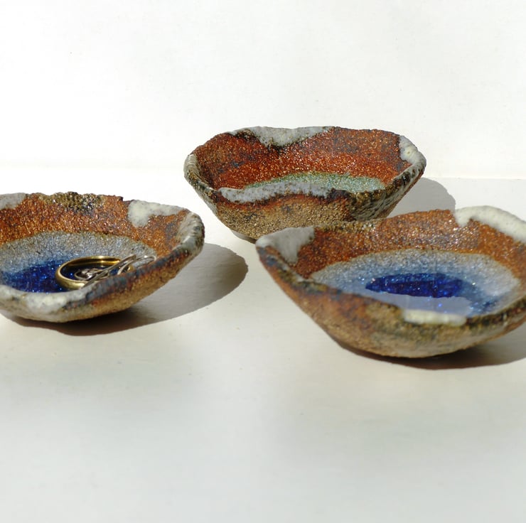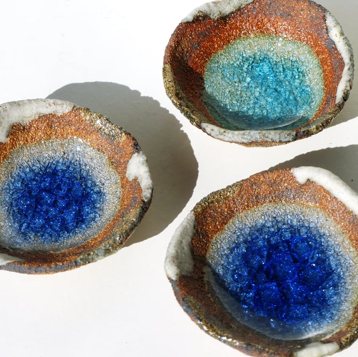 A set of three handmade stoneware ceramic bowsl with a blue pool of melted glass in the centre.