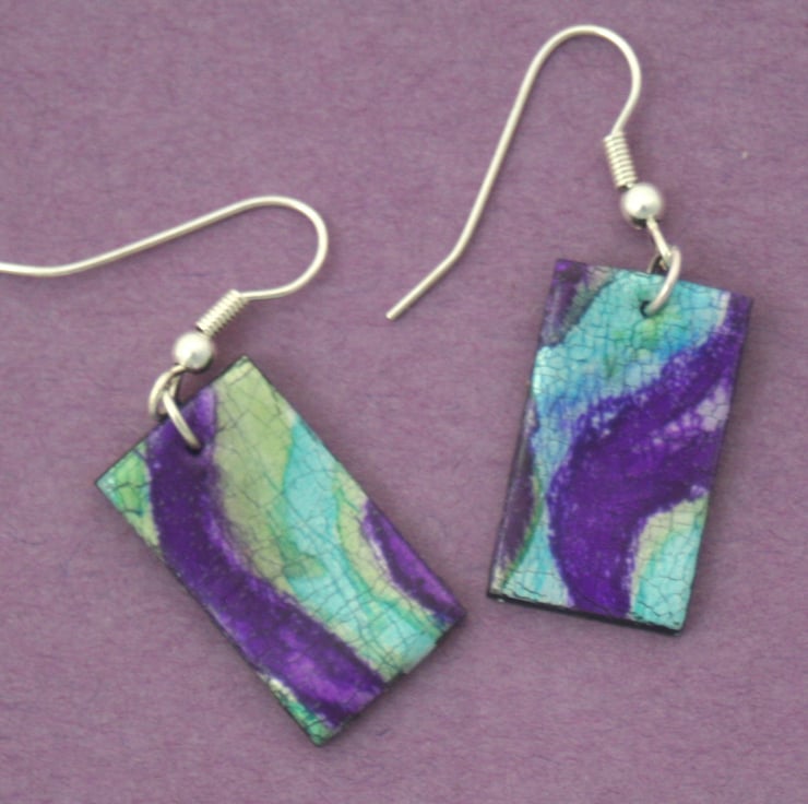 Green and purple ink-painted foil on polymer clay with silver-plated ear wires.