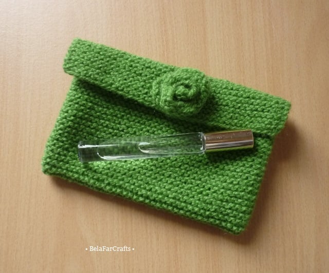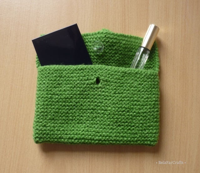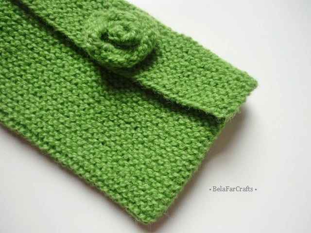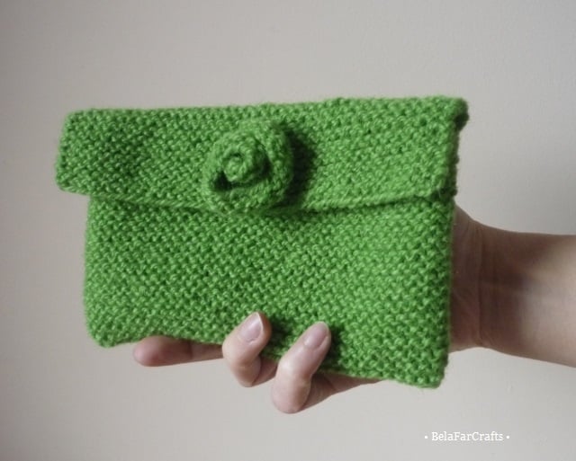 I knitted this wallet clutch in cheerful, bright green British wool. It features a knitted flower and closes with a button.