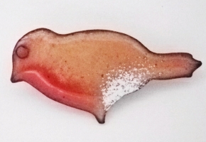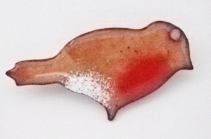 This brooch. is made in clear enamel, using the colour of the copper base as the bird's brown colouring, embellished with red and white to give the features of the bird.