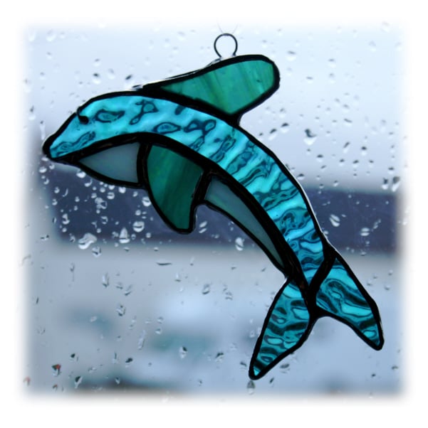 This is a stained glass suncatcher, a dolphin, made using the Tiffany copper foil technique.