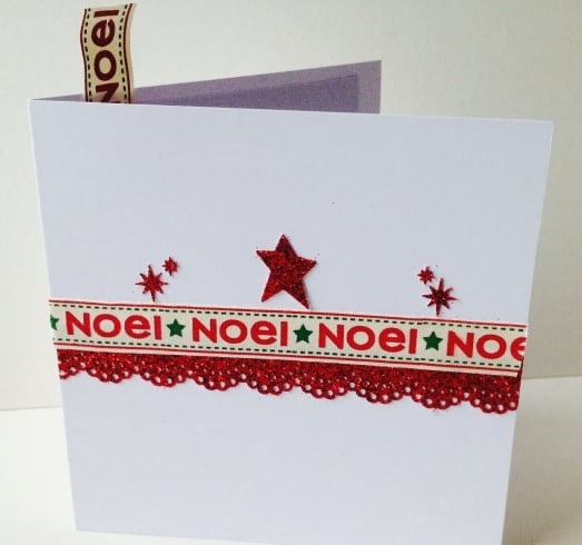 The design consists of a festive 'Noel' Ribbon qnd a pretty red glitter, scalloped edge embellishment. Also there are a selection of matching glittered stars.