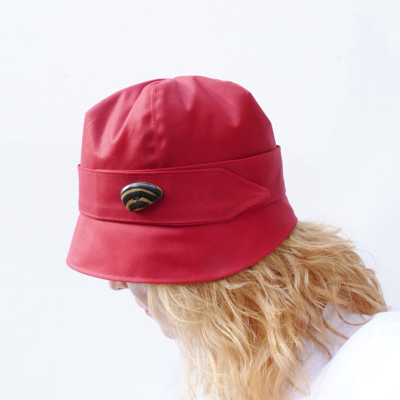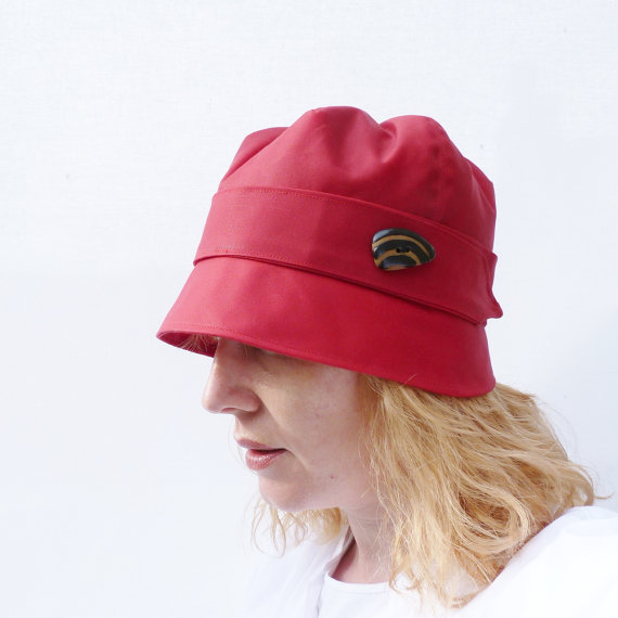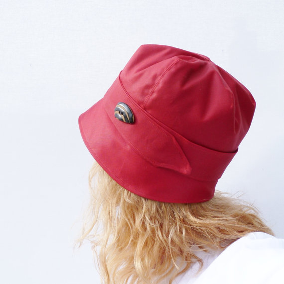 A fun yet practial rain hat handmade from a waxed red cotton canvas fabric. The fabric has been waterproofed with a fabric waterproofing wax which gives the fabric a lovely soft sheen and a soft feel. The hat is fully lined with a cotton fabric. A decorative band and a fantastic fair trade handmade button finishes the hat off beautifully.