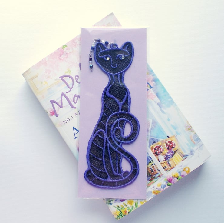 Beautiful embroidered Kitty bookmark with bead charm