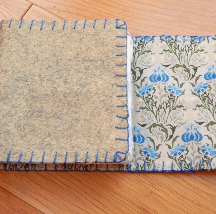 A journal with a wool felt cover, patterned fabric lining and hand embroidered embellishment.