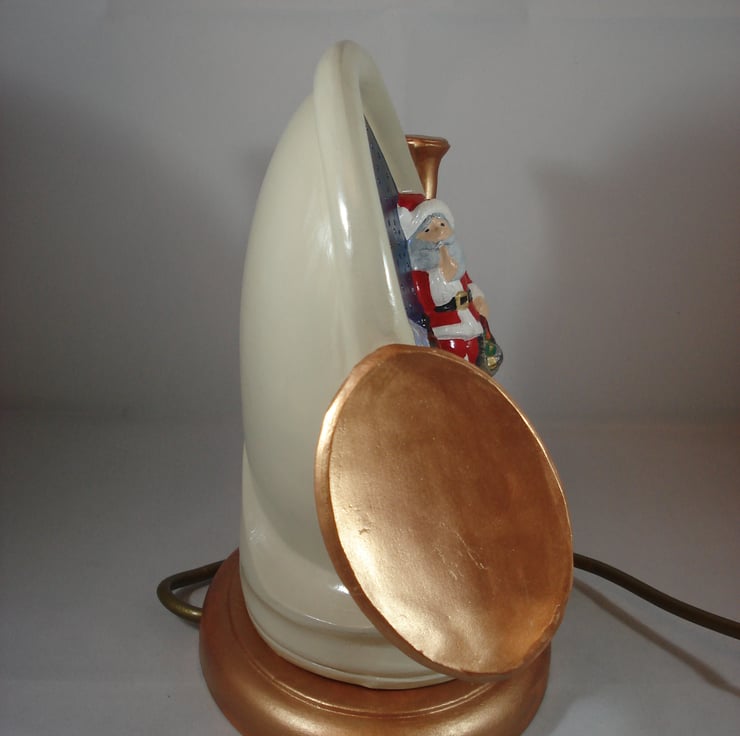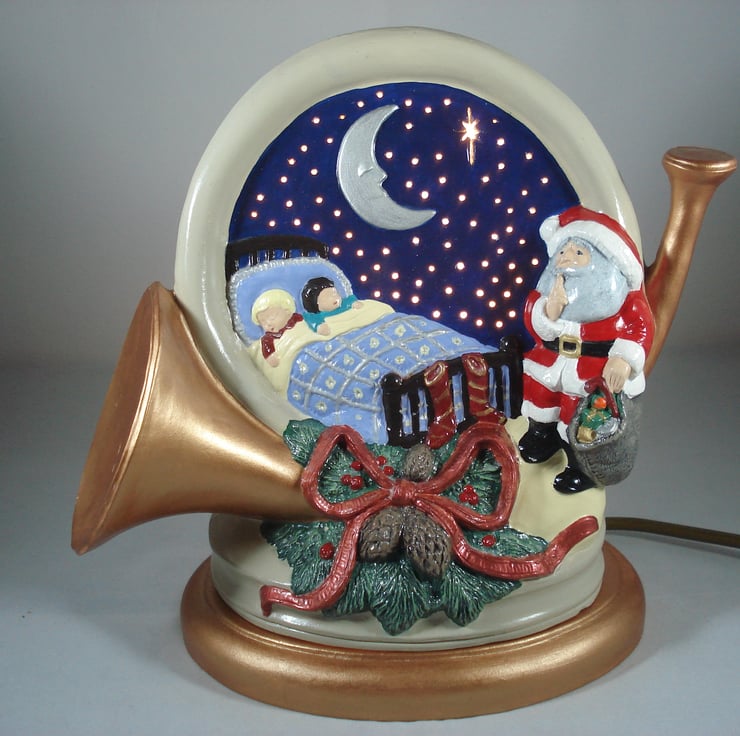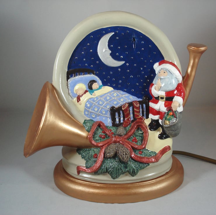 I have for sale a ceramic Christmas table lamp, which was hand painted by myself. It is a French horn with 'The Night Before Christmas' scene, depicted in the background. The children are asleep in bed and Father Christmas is at the foot of the bed. This lamp comes complete with a completely separate base, which contains the electrics. Also included in the sale is a free G9 LED bulb. PLEASE NOTE: the plug will be supplied, but it will NOT be fitted. This would make a lovely addition to anyone's Christmas decorations, or perhaps given as a gift.