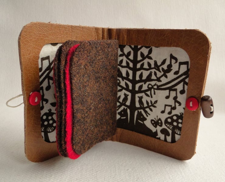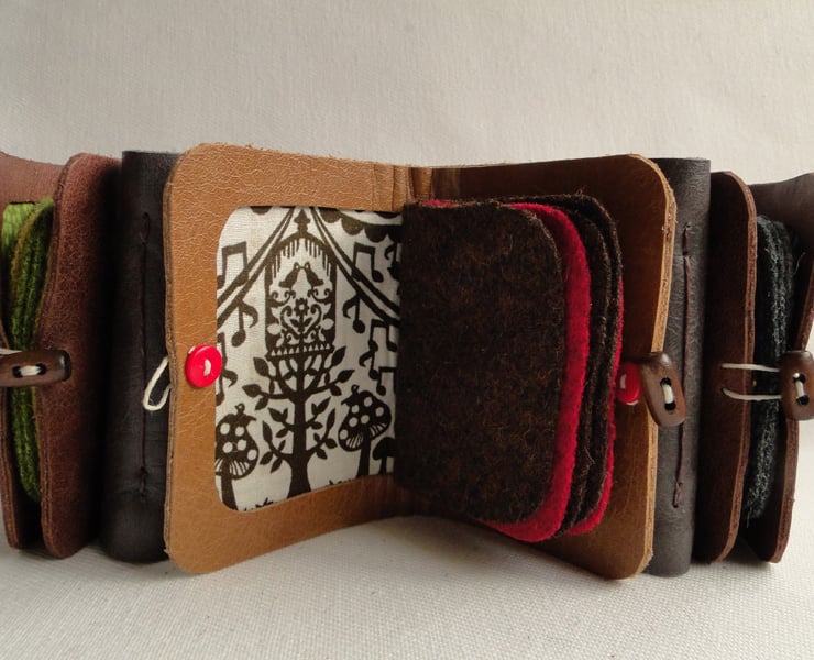 Keep them together in this brown leather case, measuring 9cm x 7xm with a folklore forest fabric interior and six separate 'pages' for needle storage in brown and red felt. Fastened with a toggle button.