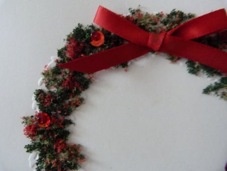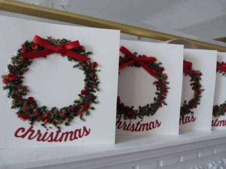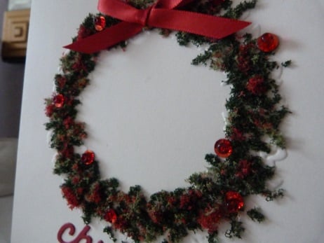 This is a pack of 4 Christmas cards, same design. Consisting of a circle of leaves embossed onto quality cream card. The circle has been decorated with red, dark green, light green fairy soft. Red sequins with red bead centres added and a red ribbon bow. Finished off with Christmas which has been die cut from quality red card.. .