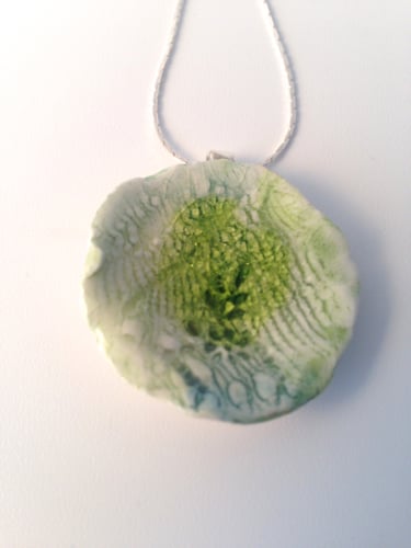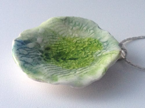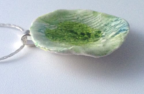 A porcelain necklace handmade with a delicate texture and light green glaze finish, layered with fresh green glass. Gorgeous and translucent it is a one of a kind piece that will add interest to any outfit.