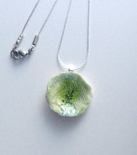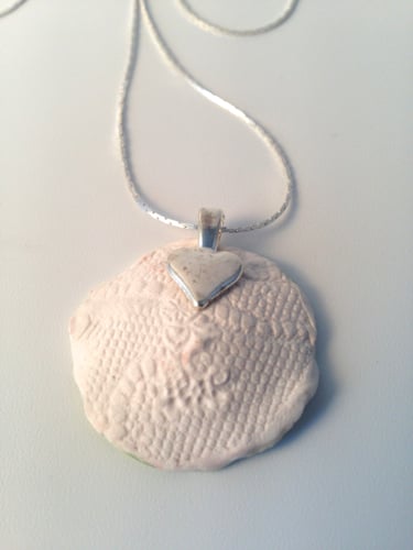 The porcelain disc hangs from a silver chain fastened with a lobster calsp.
