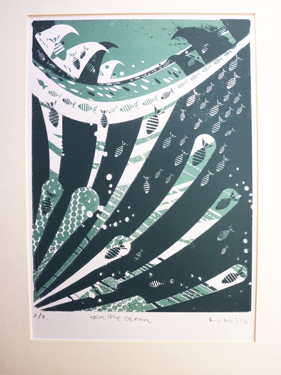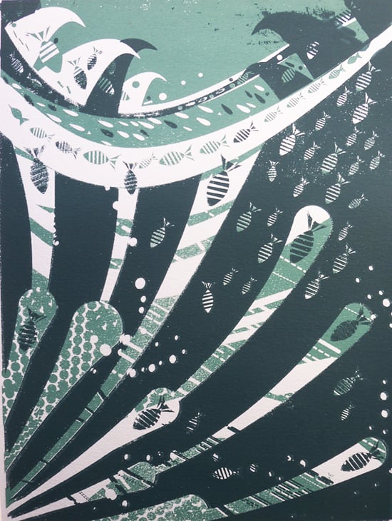 Fish swim under and amongst the ocean wave in my 2 colour screen print. The colours are a rich dark green and a blue green.