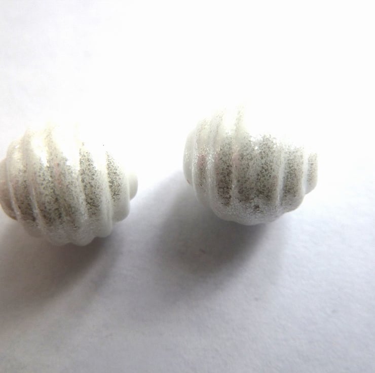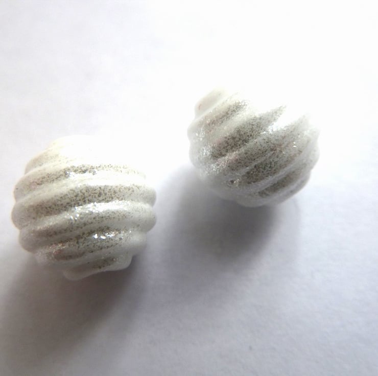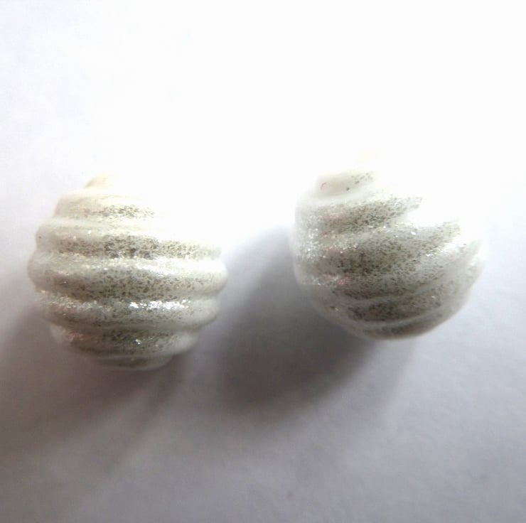 A pair of handmade lampwork glass beads which have been made with white glass, rolled in glitter and then shaped using a graphite marver.