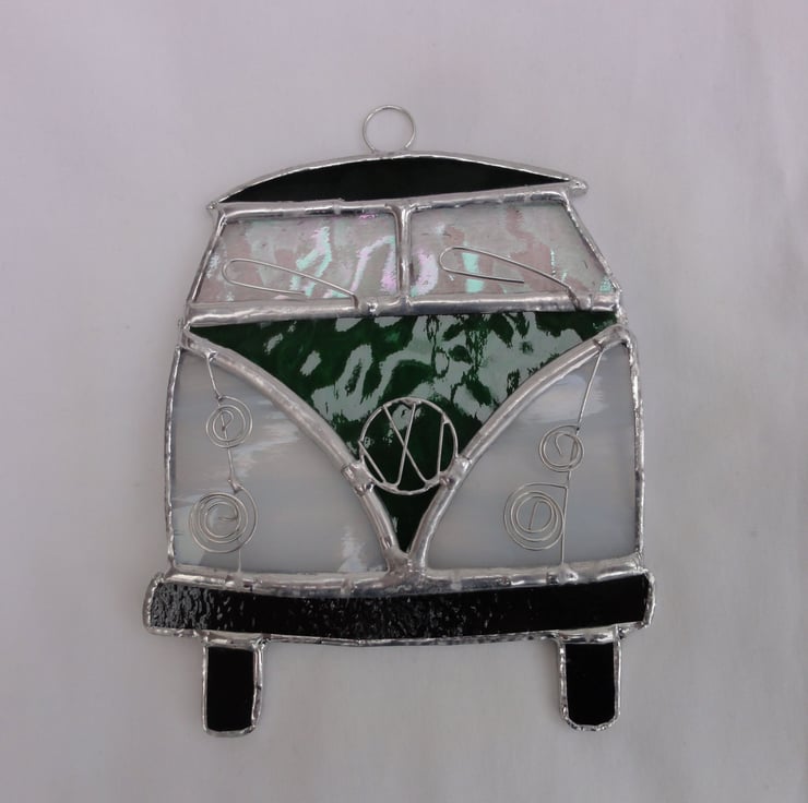 Each piece of glass has been copper foiled and soldered together. Tinned wire has been twisted and added for detail on the van for the windscreen wipers, side and head lamps and the 'VW' symbol. A wire ring has been attached for hanging.