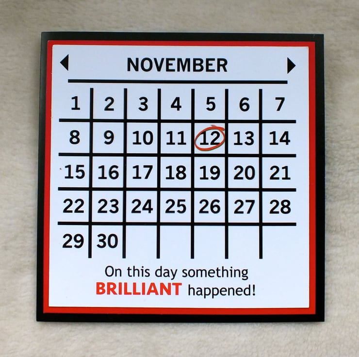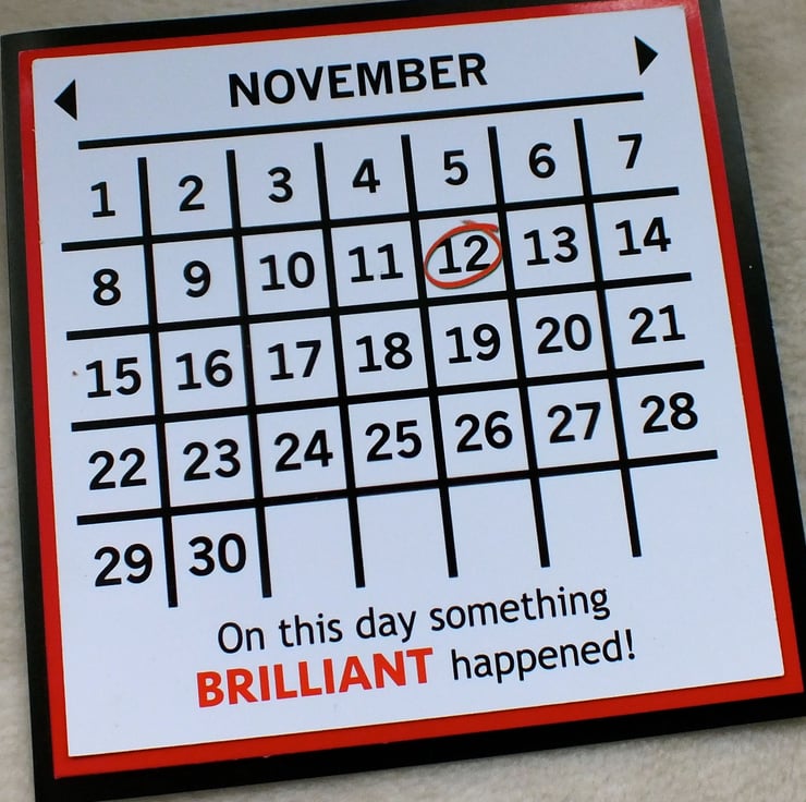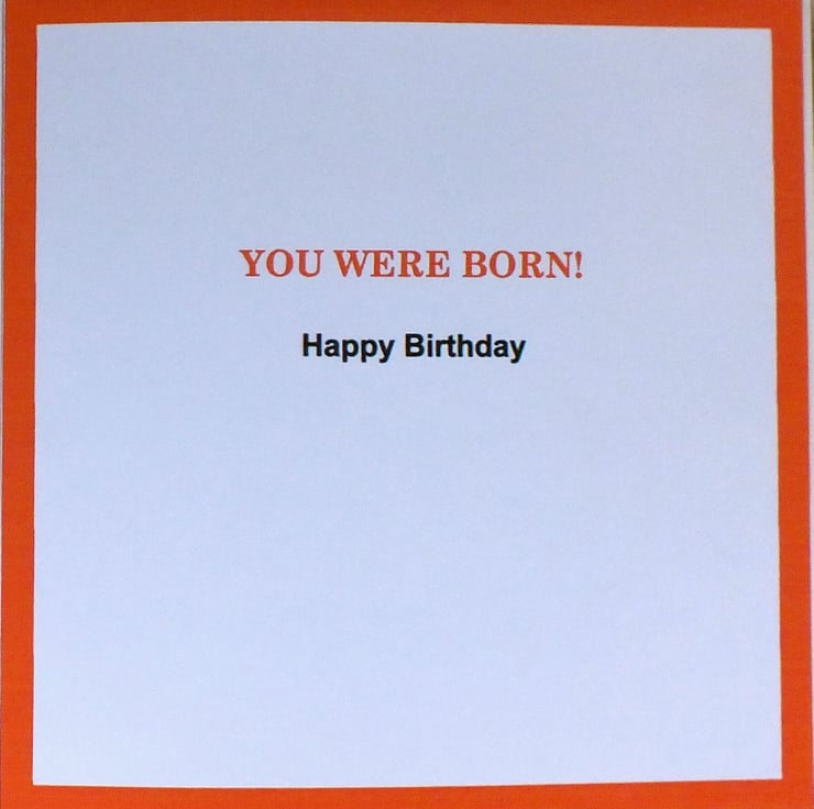 This makes a great birthday card. It’s approx. 7”x7” in size, matted and layered with high gloss black and red card, with personalised birth month and day date. Card front reads ‘On this day something BRILLIANT happened!’, inside reads ‘YOU WERE BORN! Happy Birthday’.