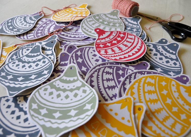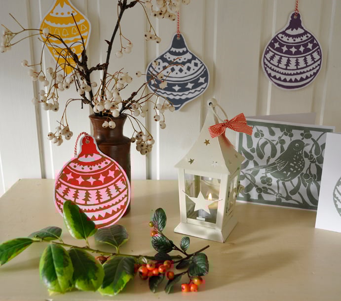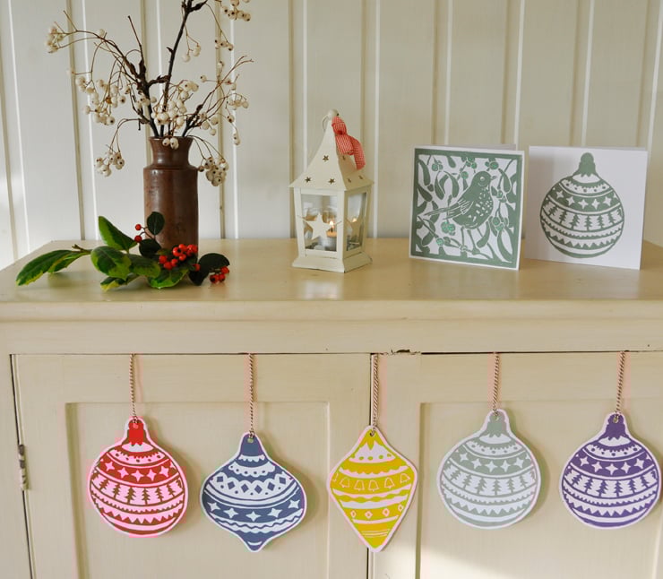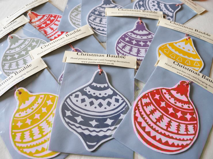 Each bauble is carved from a individual block of lino and then hand printed onto paper before being mounted onto card.
