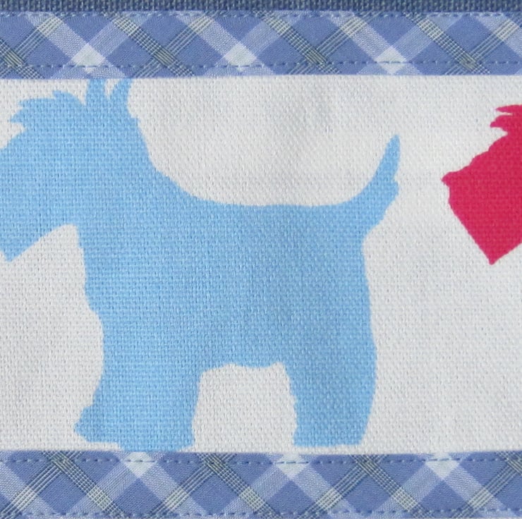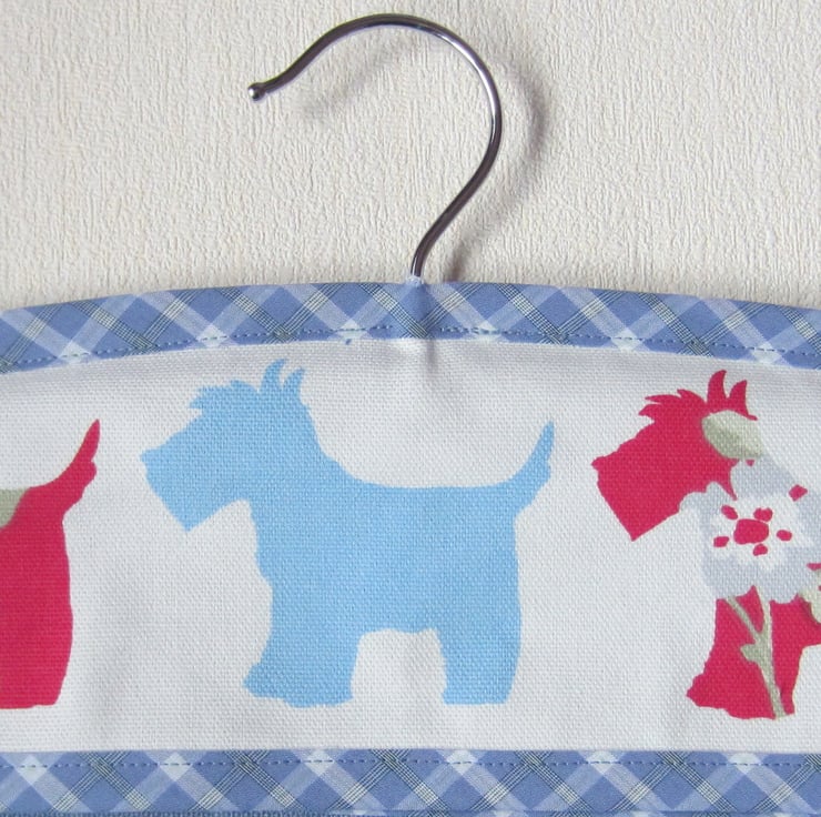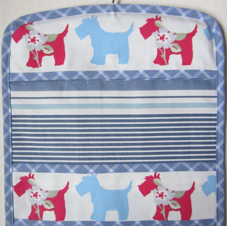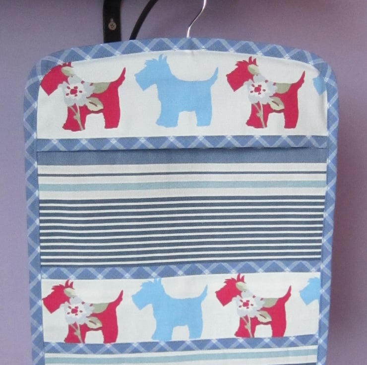 Sturdy striped peg bag with Scottie dog panels. Edged with blue check bias binding and lined with light blue fabric. Lots of room for plenty of pegs or use for other storage such as lingerie, tights, socks etc. It measures 30 cm wide and 34.5 cm long. Hangs with a strong wooden coat hanger.