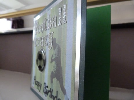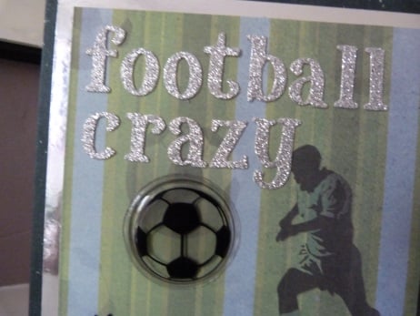 A design of a footballer printed paper has been mounted onto silver mirri card and then onto dark green flecked card. The words 'football crazy' cut from silver glitter card, Happy Birthday from black mirri card all decorate the card.Finished off with a gel football.