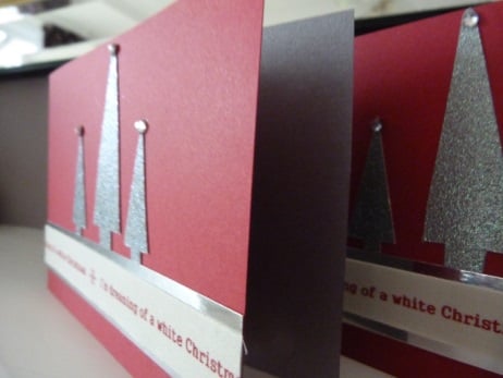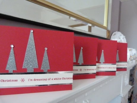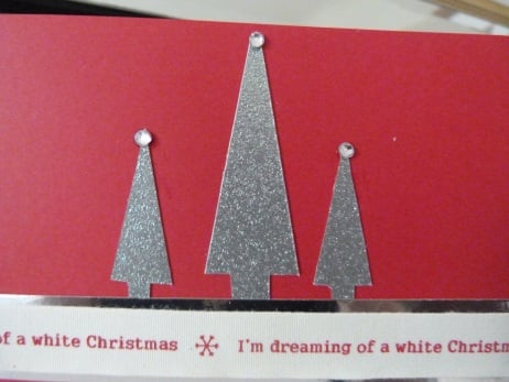 A pack of 4 cards, all of the same design consisting of 3 Christmas trees hand cut from silver glitter card. I'm dreaming of a white Christmas ribbon mounted onto silver mirri card and all onto red card. The trees finished off with silver rhinestones.