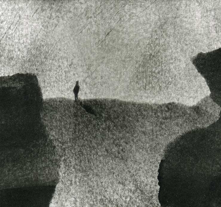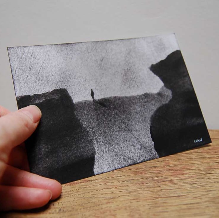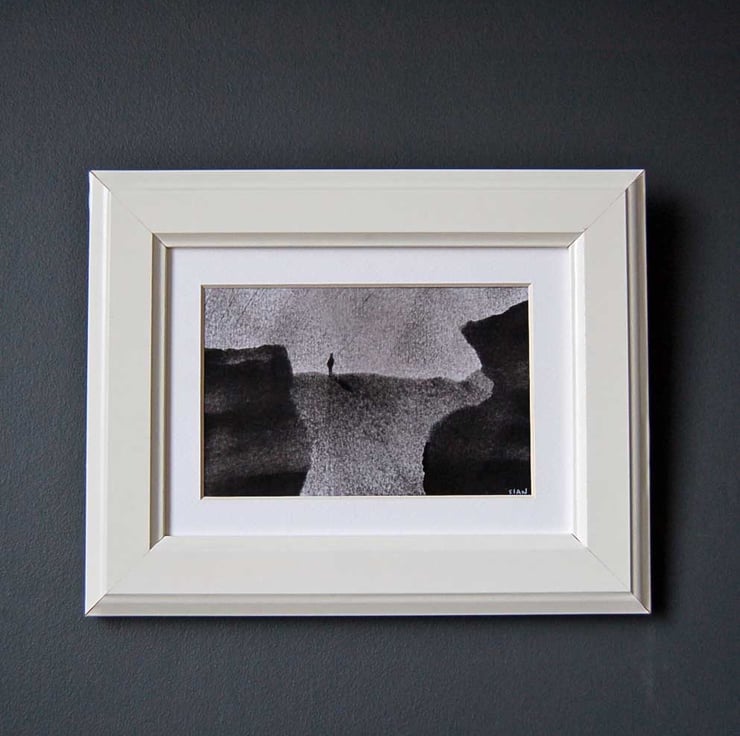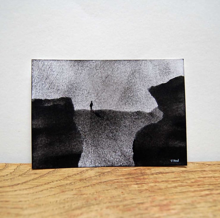 This is one a series of original paintings depicting a solitary walker casting their shadow between two tors or rocky outcrops in a moorland landscape. This one is admiring the view from what is probably a gritstone edge. The painting is made by applying black pigment ink onto drawing paper using sponges and stencils.