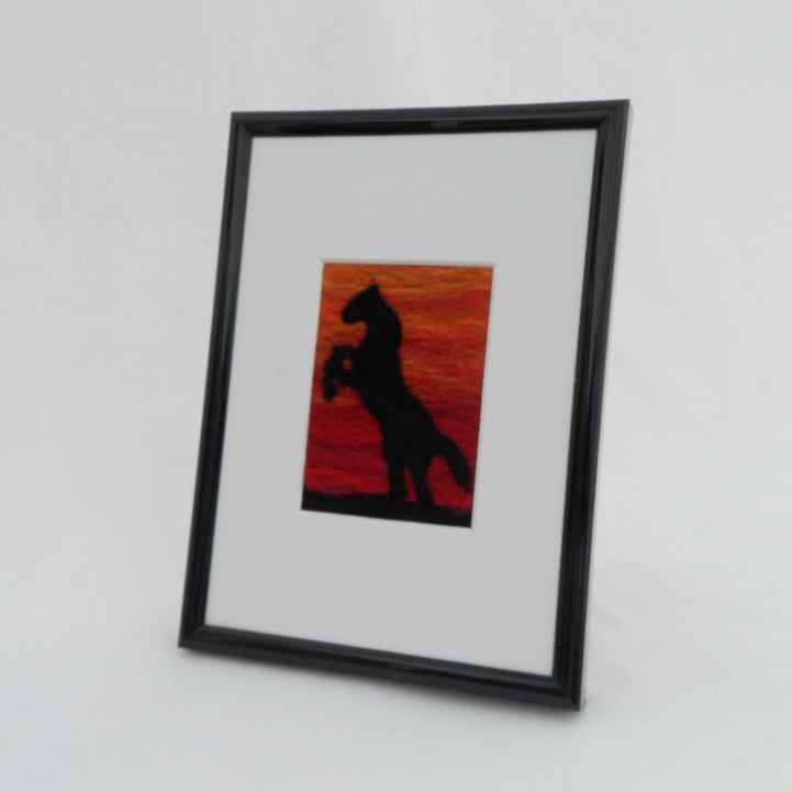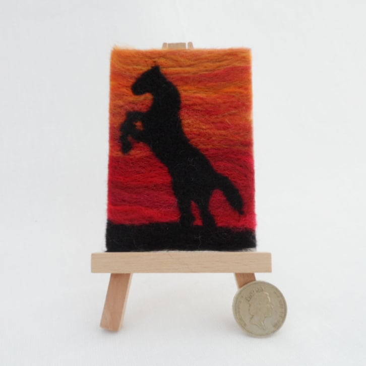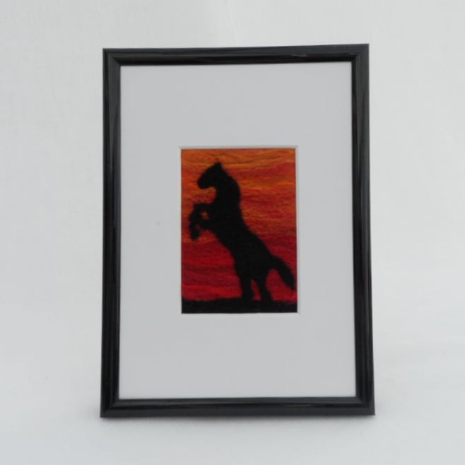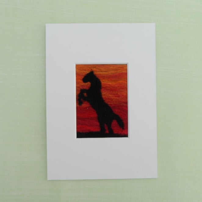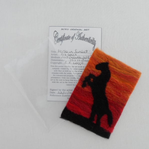 This ACEO is a picture of a horse rearing in the sunset needle felted using merino wool on a wool blend (30% wool, 70% acrylic) felt base and then mounted on 300gsm card, signed and dated on the reverse. It also comes with a certificate of authenticity and plastic sleeve to protect it.