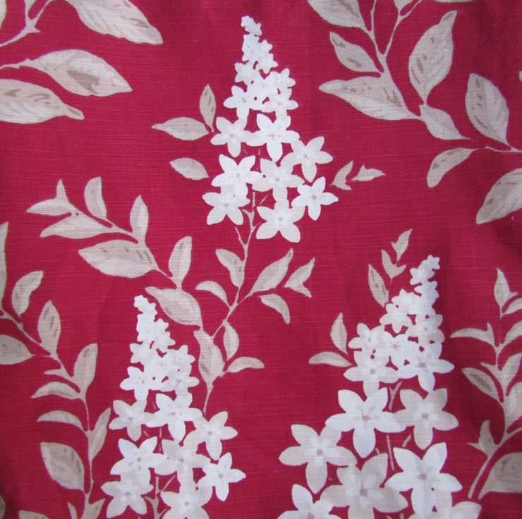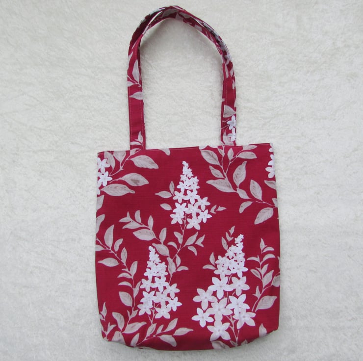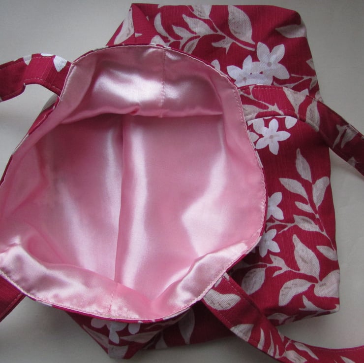 A pretty tote bag in a deep pink fabric with a beautiful white and cream floral print pattern. The bag is fully lined with a pale pink satin-finish fabric.