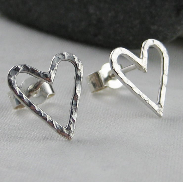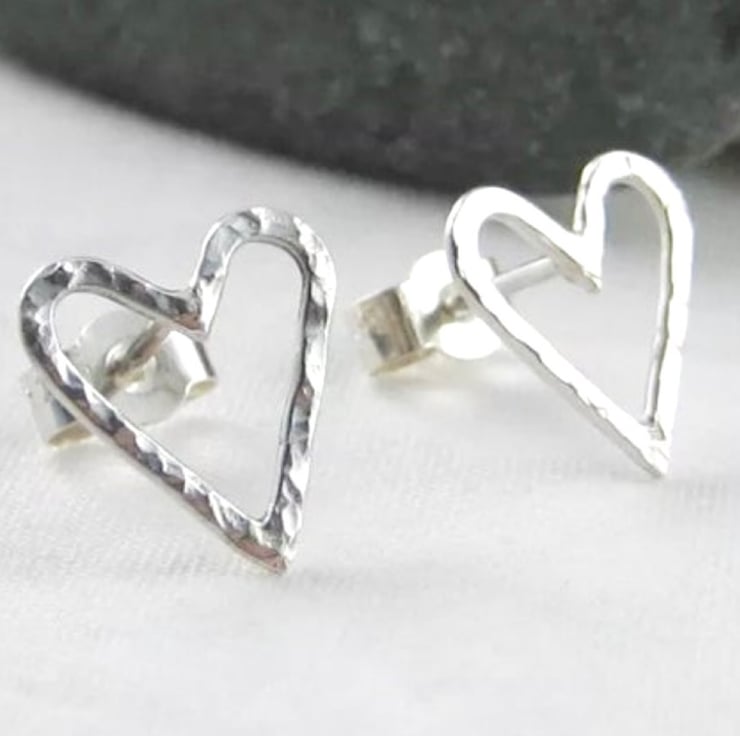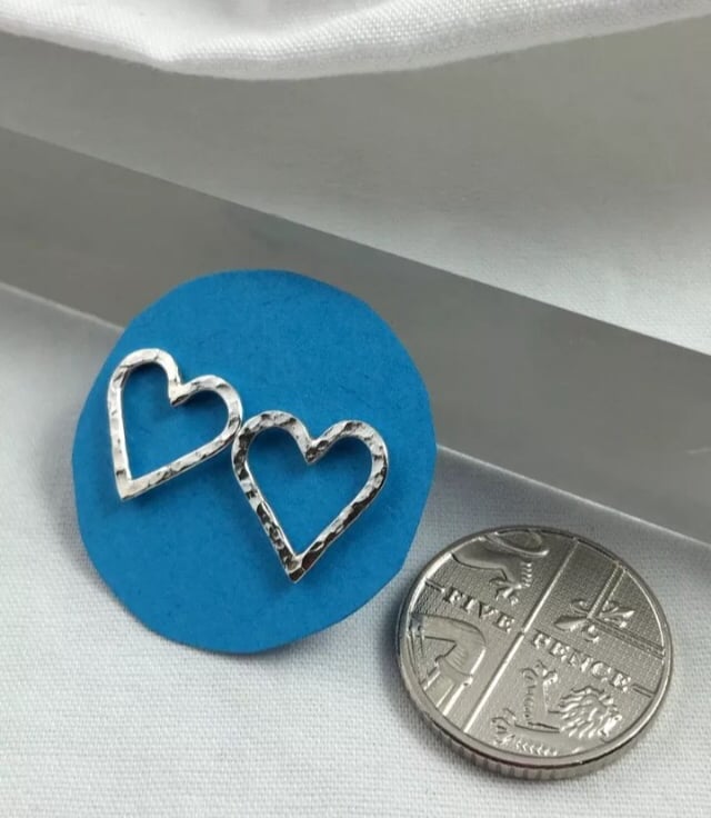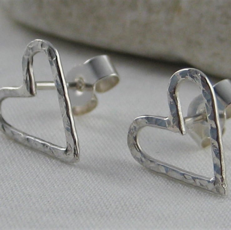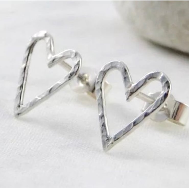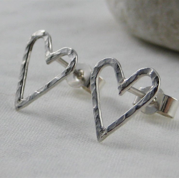 A lovely pair of pretty heart ear stud earrings handmade from 925 sterling silver. Cut by hand from solid 1mm thick silver wire, formed into shape then hammered to create their unique sparkly textured surface. They have long silver pin fittings and are secured with stamped (925) silver scroll’s/butterfly’s