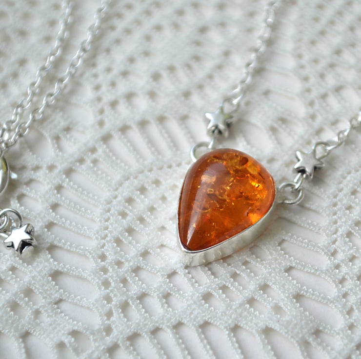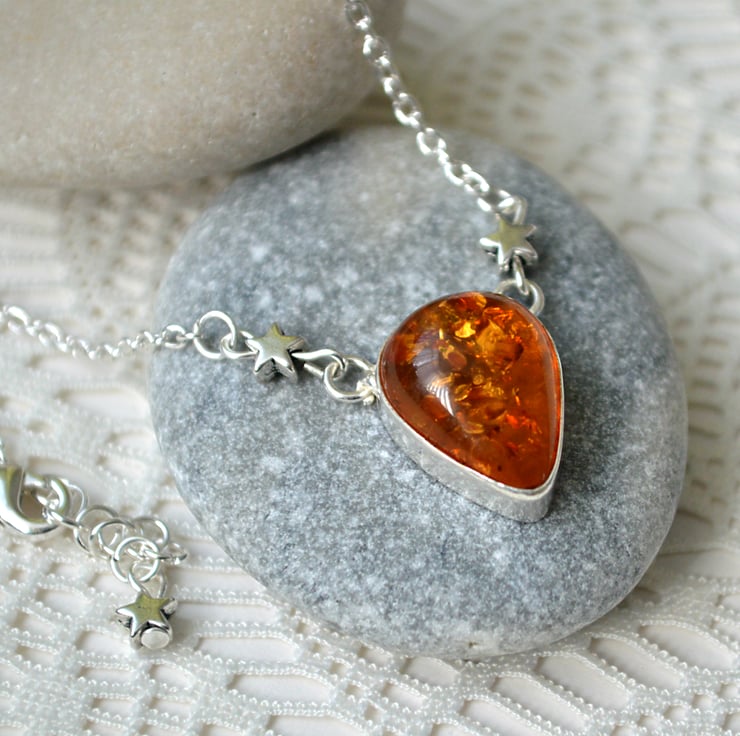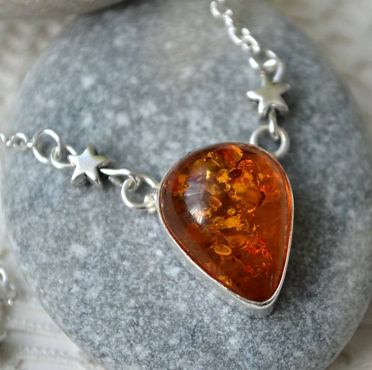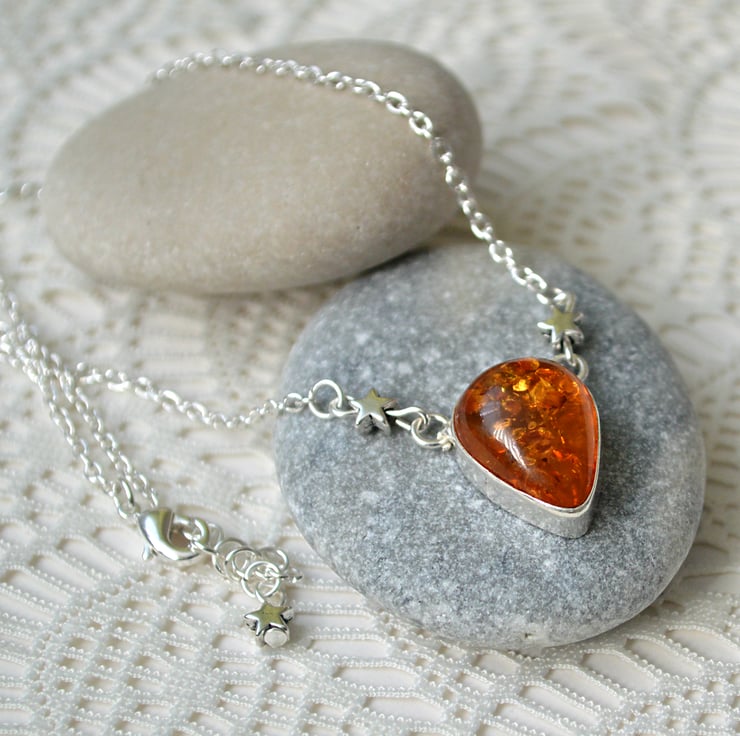 A stunning necklace featuring a pressed amber teardrop pendant in a gorgeous, golden, orange shade and cute silver plated stars.