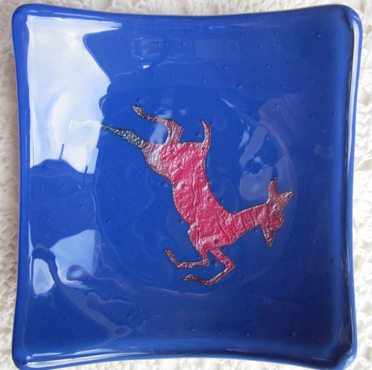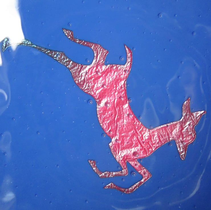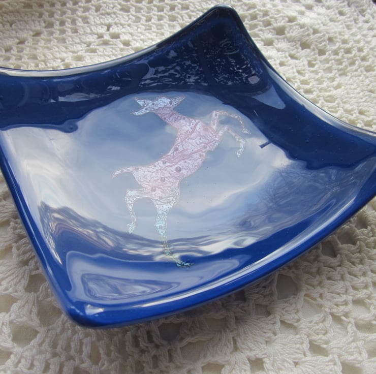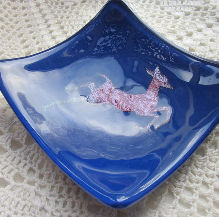 This bowl has a copper deer on deep blue glass and is approximately 5 1/2 inches across. The heat has turned the copper a lovely dark matt red and blue and the colour in the copper is amazing. This bowl is very striking! It has been fully annealed to make it strong. This would make a great gift or treat.