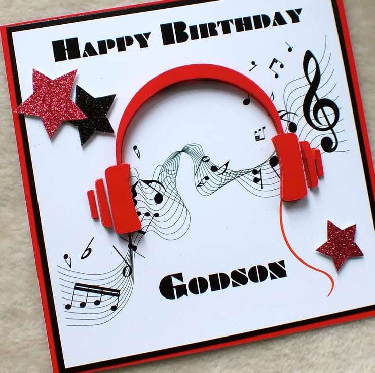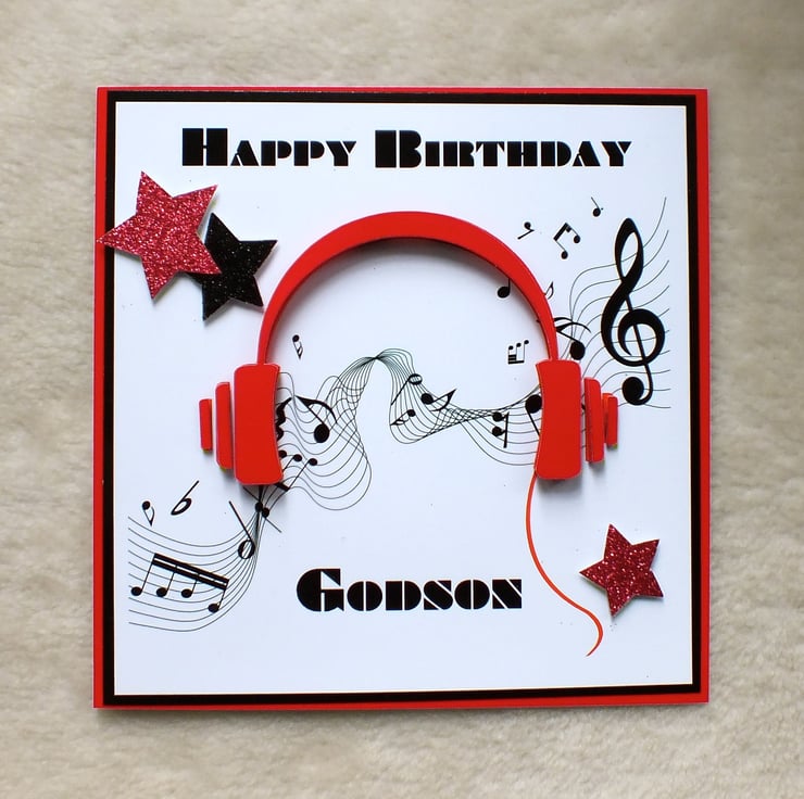 Your Godson will love this stylish headphones birthday card. Measures 7”x7” and is matted and layered with glossy red and black card. The head phones have been die-cut and layered up, and embellished with hand cut glitter stars. Includes the sentiment, ‘Happy Birthday Godson’, inside.