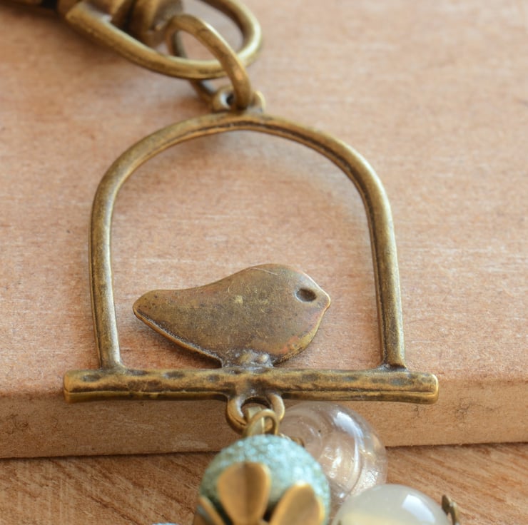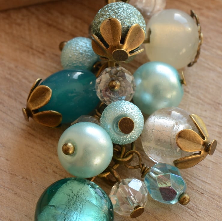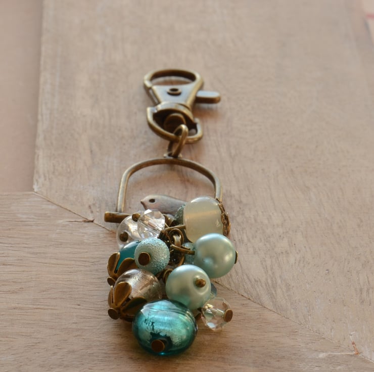 A lovely antique bronze plated bird charm with a cluster of beads in shades of aqua blue, white and crystal including foil lined, glass pearls, faceted glass and indian glass some with little antique bronze plated beadcaps.