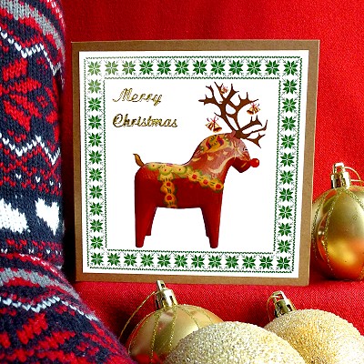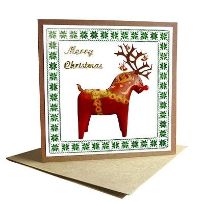 Each card is 5” square (13.5cm), is made from recycled 300gsm brown card & comes with a made-to-measure brown envelope. Both items are sealed into a protective cellophane pouch. The colour photograph of the dala horse is printed on glossy photographic paper & is surrounded by a green Nordic-print border. The ‘Merry Christmas’ embellishment greeting on the front of the card is in gold, while inside there is a blank insert with the same green Nordic-print border for you to write your own greeting.