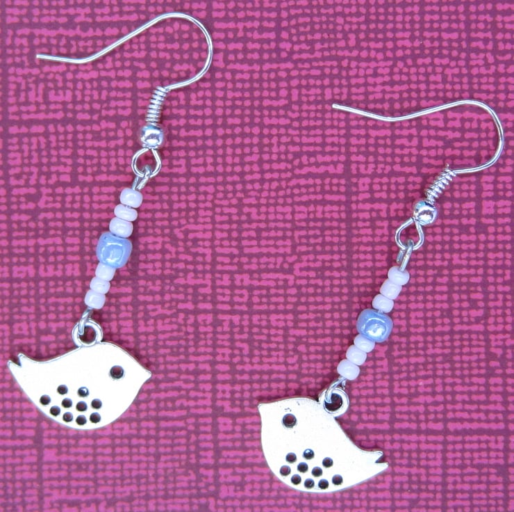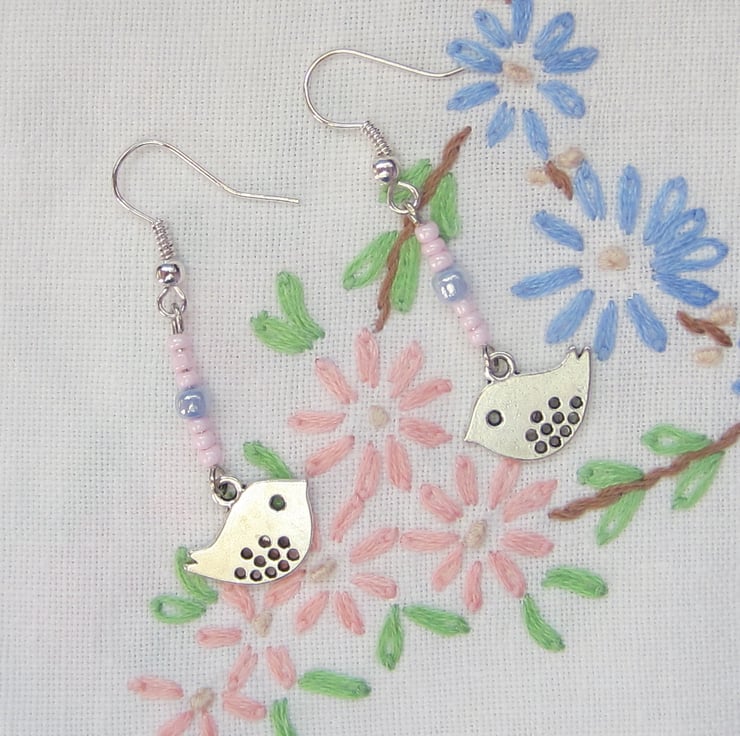 Sweet little bird charm earrings with pastel pink and blue beads on silver plated ear wires. They measure 3 cm long.