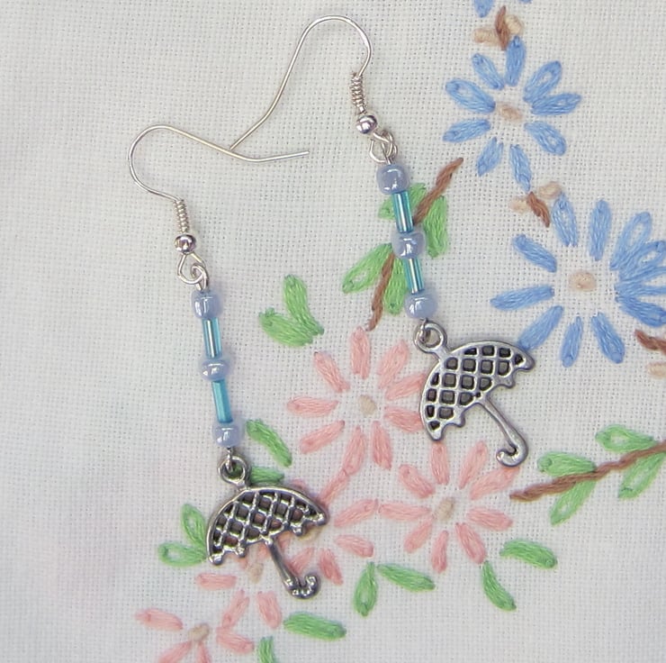 Quirky umbrella charm earrings with pastel blue beads on silver plated ear wires. They measure just over 4 cm long.