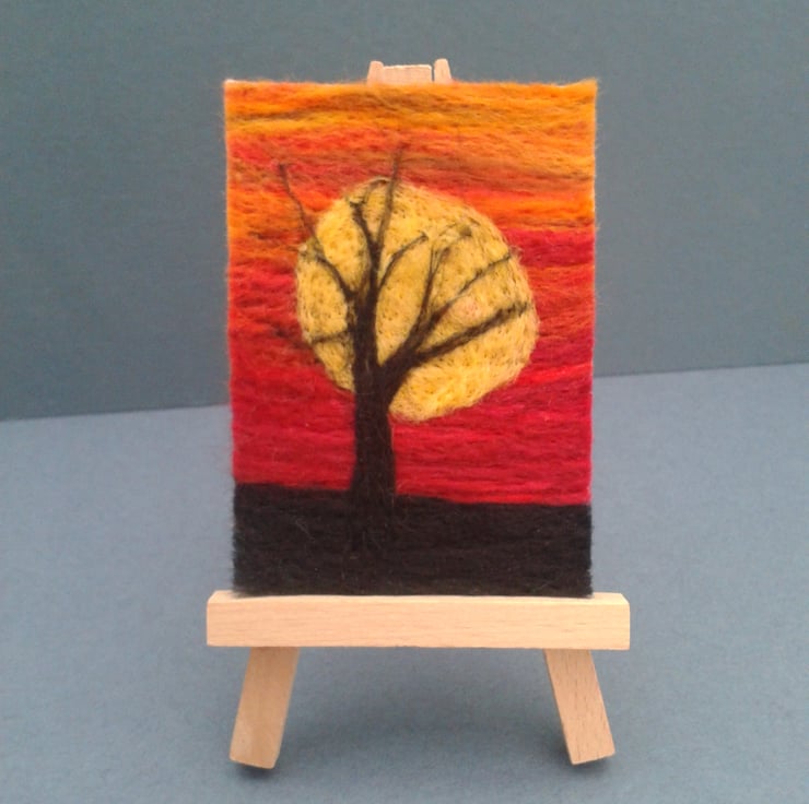 This ACEO is a picture of a bare tree silhouetted in a winter sunset needle felted using merino wool on a wool blend (30% wool, 70% acrylic) felt base and then mounted on 300gsm card, signed and dated on the reverse. It also comes with a certificate of authenticity and plastic sleeve to protect it.