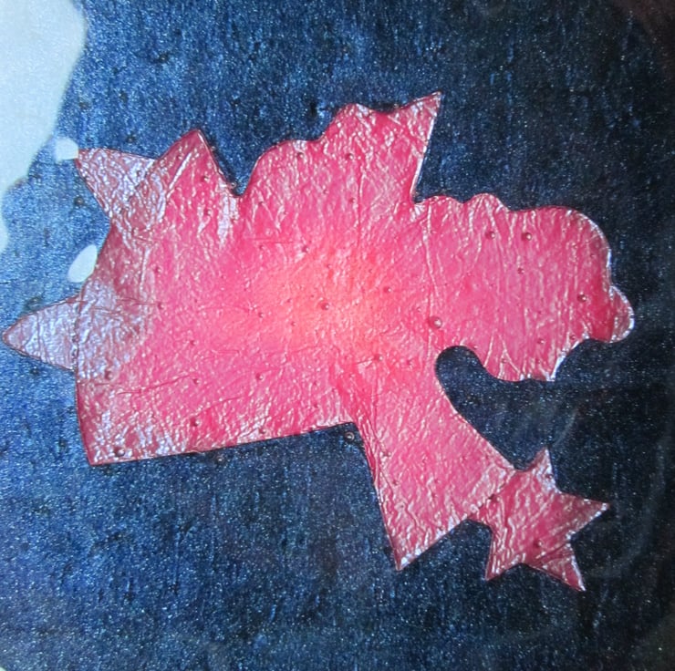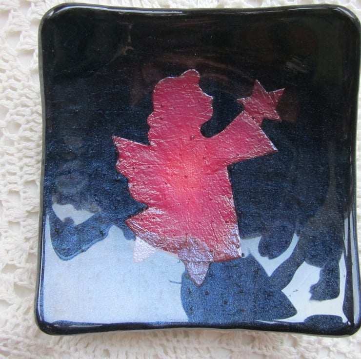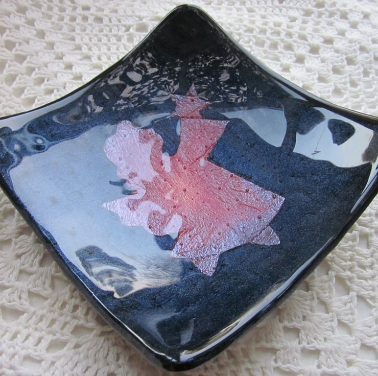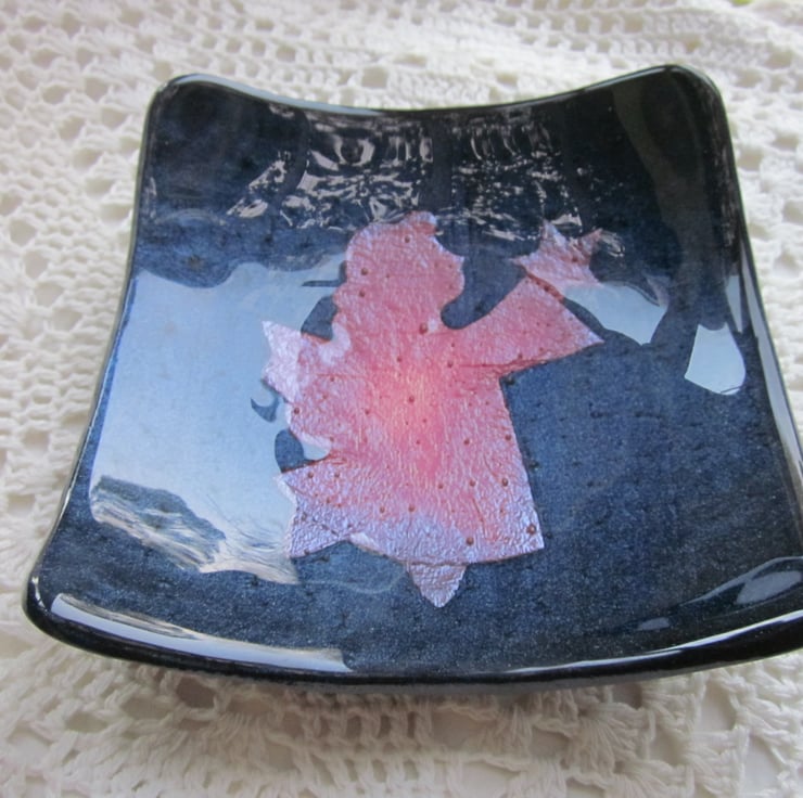 This bowl has a copper angel on deep blue aventurine glass and is approximately 5 1/2 inches across. The aventurine glass naturally has a delicate shimmer and is more expensive than my usual glass. The heat has turned the middle of the copper a lovely dark matt red and blue. The surface is glossy and smooth and the colour in the copper is amazing. It has been fully annealed to make it strong. This would make a great gift or treat.