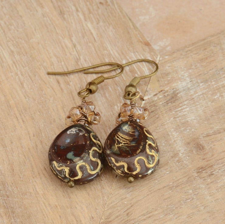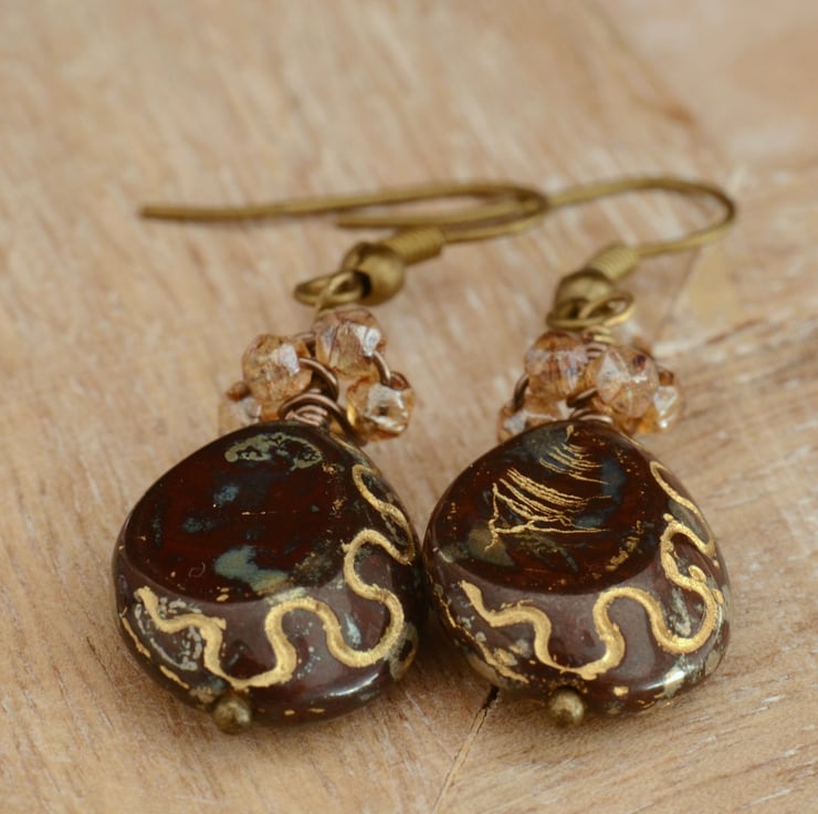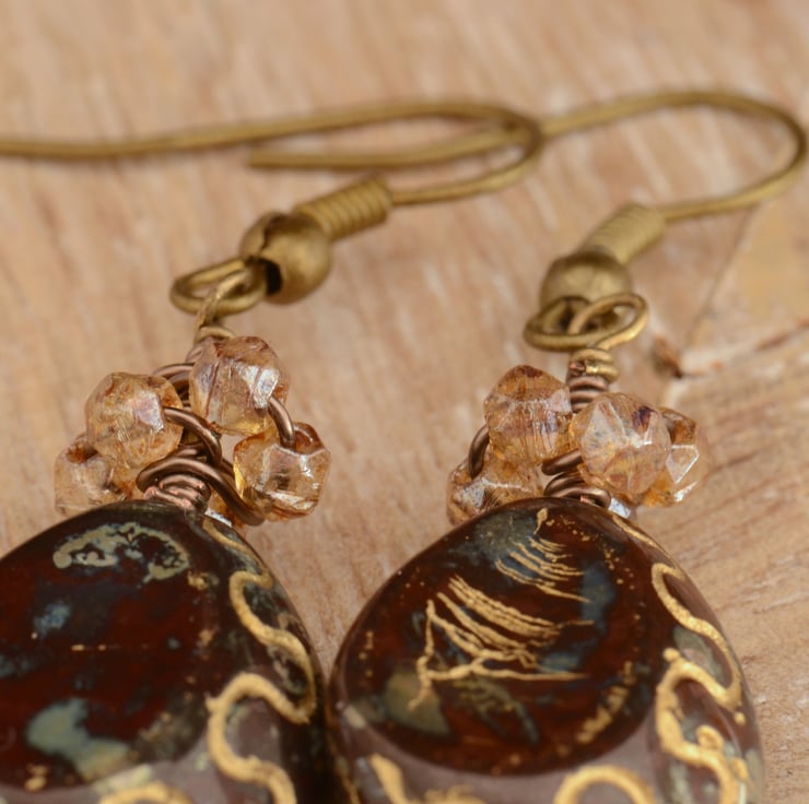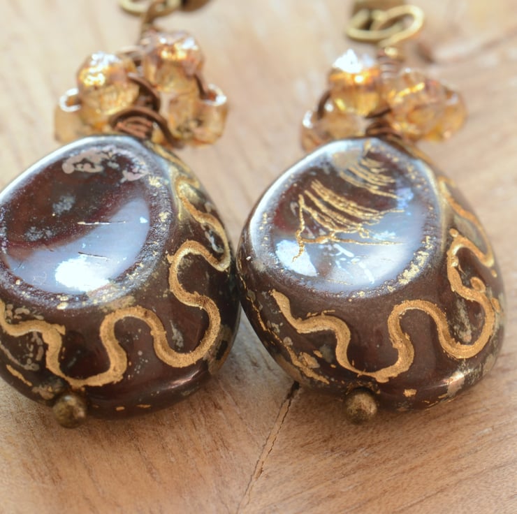 Lovely deep mahogany decorative Czech glass teardrop beads are the focal for these earrings which I have teamed with a little circle of tiny wire wrapped gold table cut faceted Czech beads finished on antique bronze plated earwires.