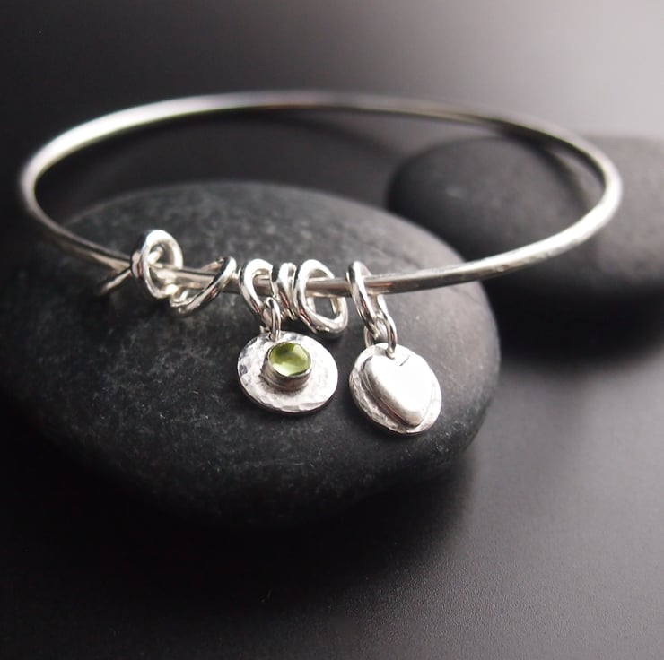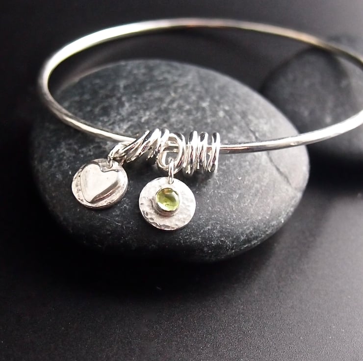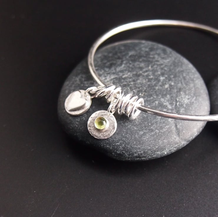 A substantial 2mm sterling silver hammered bangle holds 7 free running fused fine silver rings. There are two textured discs approximately 10mm across. One has a silver heart soldered to it and one has a 4mm peridot cabochon.