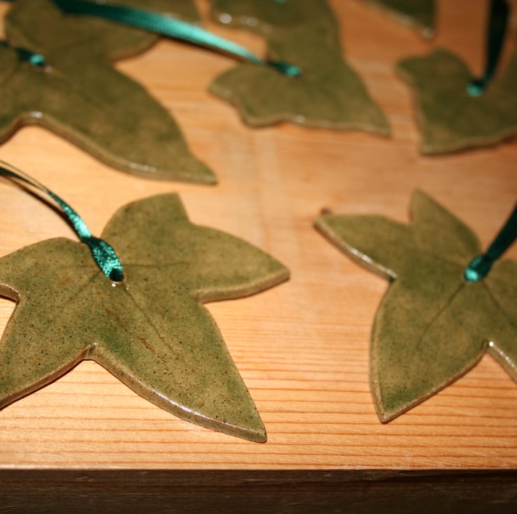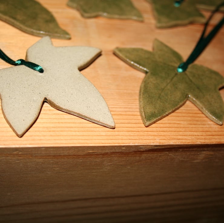 Handmade green ivy stoneware ceramic decoration, surface has been impressed with ivy leaf & finished in shiney transparent green glaze, (not glazed on back). Slight hint of leaf veins show on the surface. Green ribbon attached for hanging or attaching to parcels/presents.
