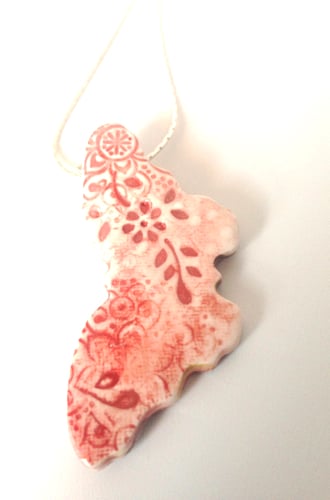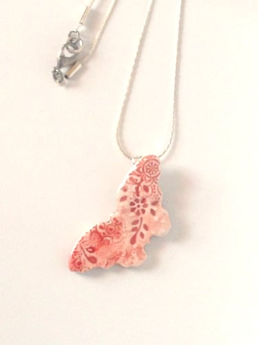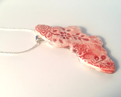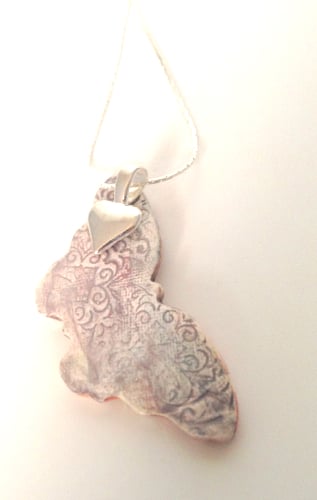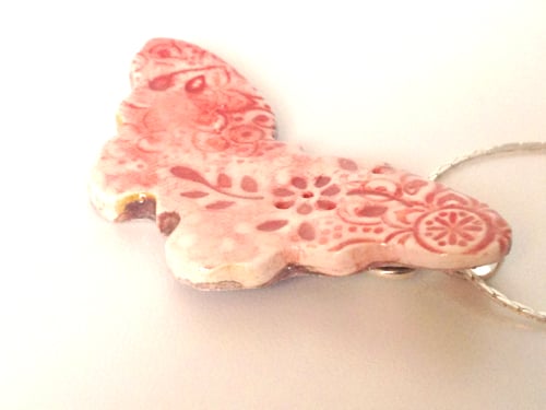 A pretty textured ceramic butterfly necklace with a delicate pastel rose glaze.